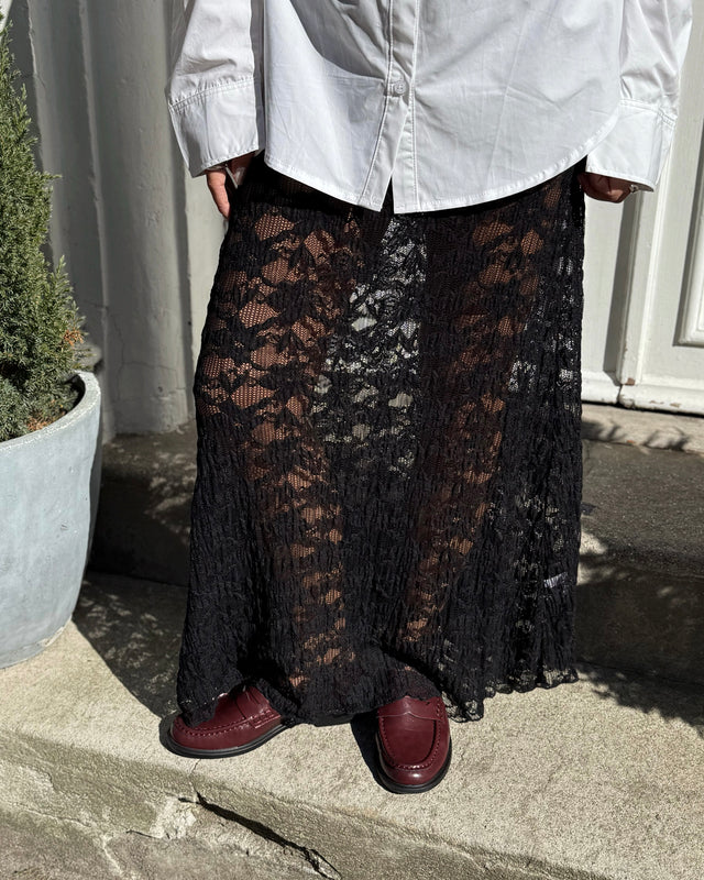 Elegant gennemsigtig maxinederdel i sort blonde.
